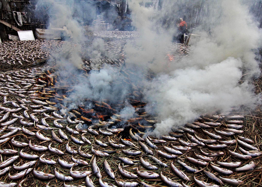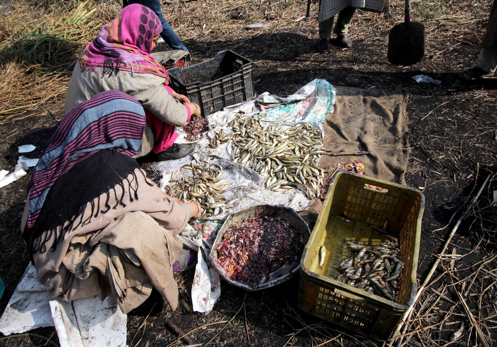Smoked fish is prepared by smoking the fish over slow-burning grass and sold by members of the Tippli community living on the banks of the Anchar lake.