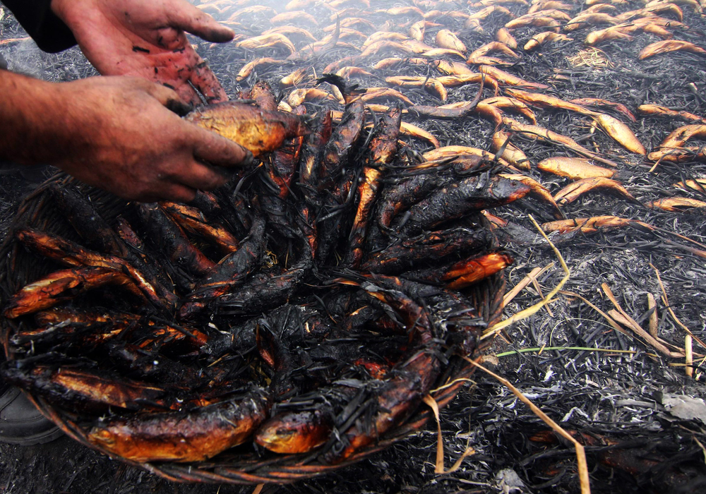 Fish is smoked for preservation and is called Phae’ir (plural Phae’rei/ Fae’rie). The local lake fish is first sun dried on dried grass for a few hours till the water is drained and then smoked.