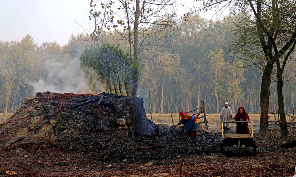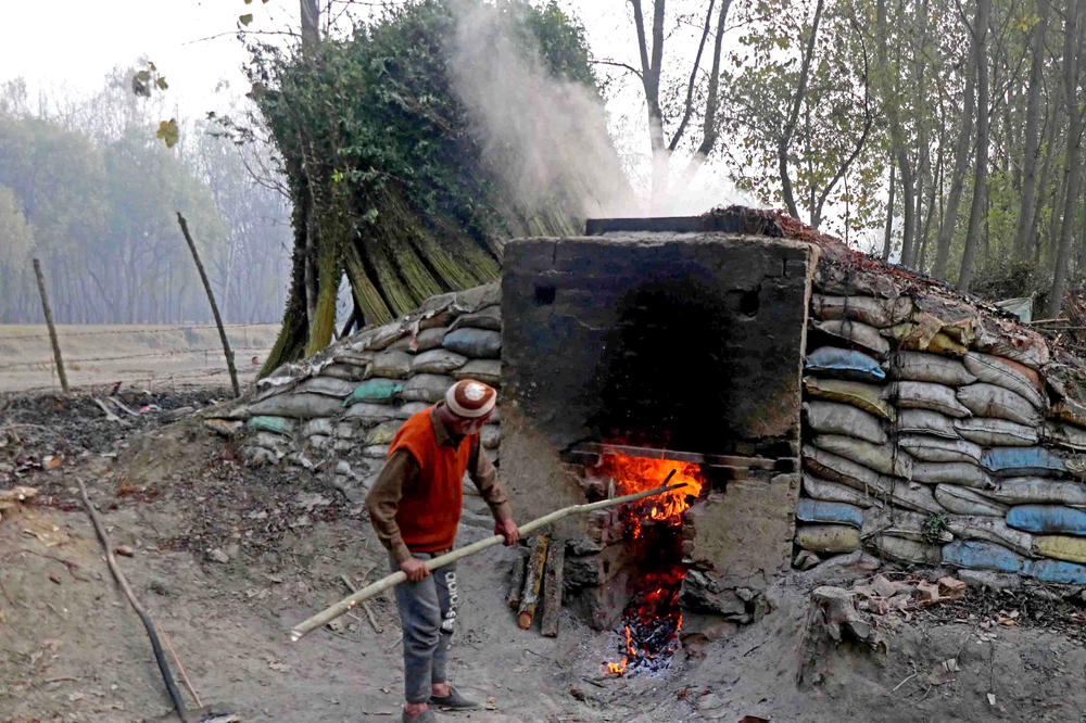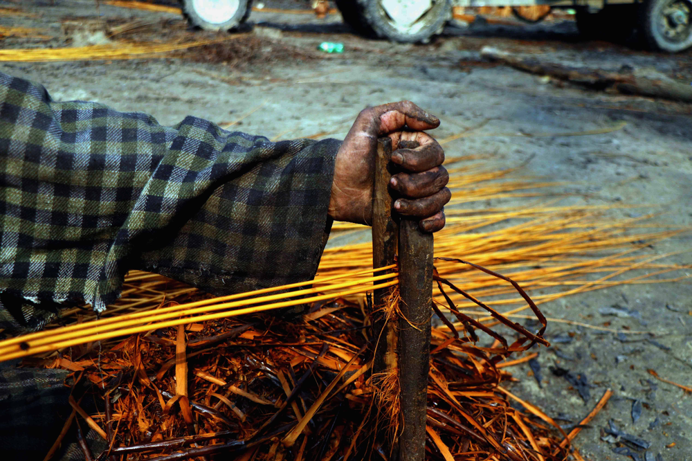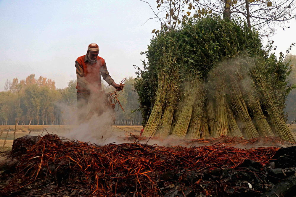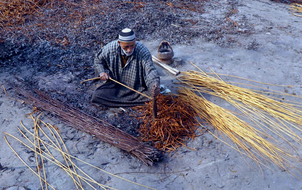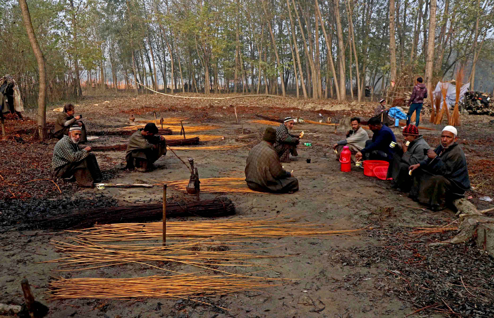 Wicker is used for making traditional baskets for fire pots called Kanger/ Kangri in Kashmir. Kashmiris use these traditional fire pots to keep themselves warm during the severe winter months of chillai kalan. Also used for making baskets and furniture. Seen here are workers peeling off the bark from the wicker twigs in Shalbugh village of Ganderbal in central Kashmir.