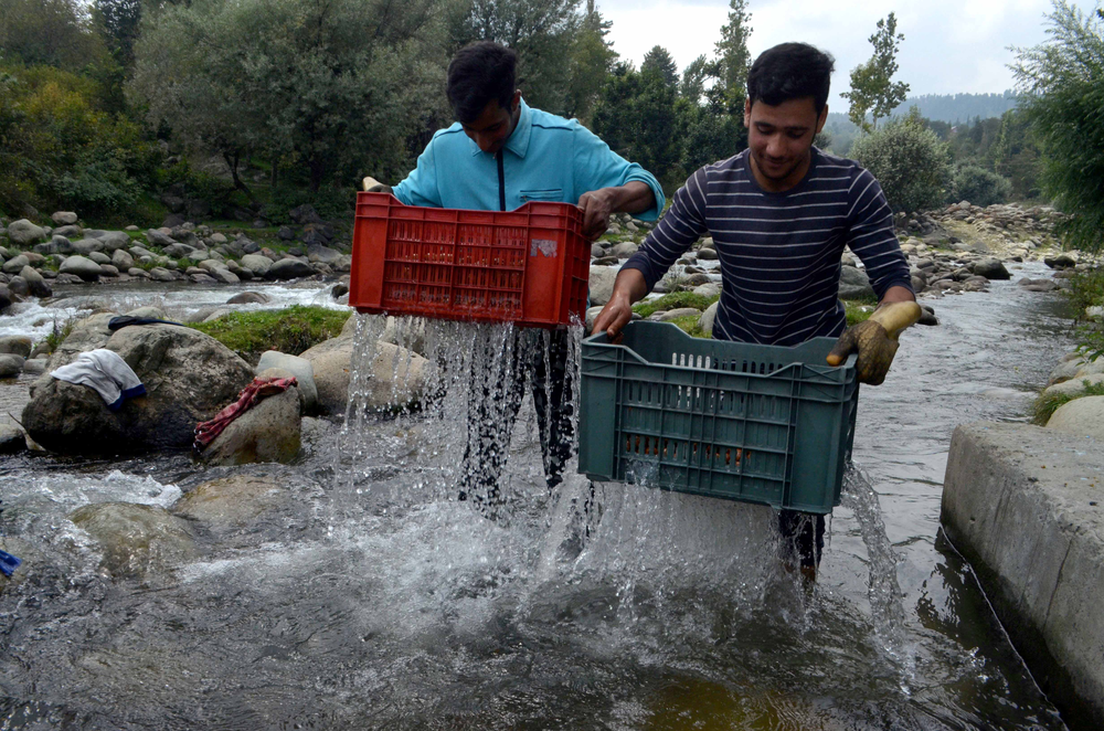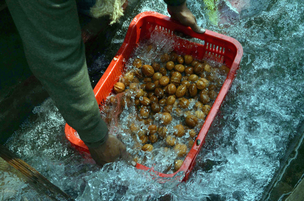 Freshly shelled walnuts being washed in the river, on the outskirts of Srinagar.