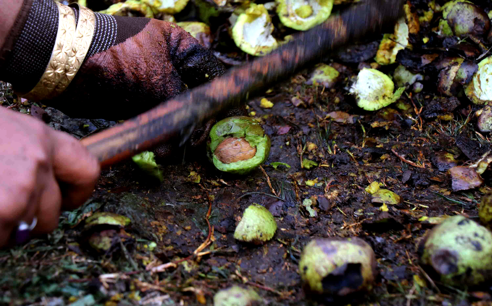 A woman breaks the outer green shell of the walnuts.